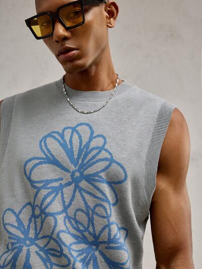 Men's Grey Floral Jacquard Knitted Sleeveless Casual Tank Top, Suitable For Daily Wear, Spring/Summer, Vacation-26%