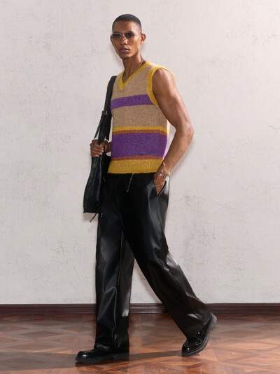 Men's Khaki & Purple & Yellow Colorblock Striped Colorful V-Neck Cable Knit Sleeveless Short Length Fuzzy Sweater, Suitable For Casual Wear And Parties, Vacation, Old Money Men, Boyfriend Gift-60%