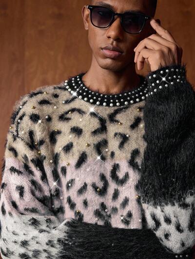 メンズカジュアルレオパード柄クルーネック長袖プルオーバーセーター(レギュラーフィット)-26%