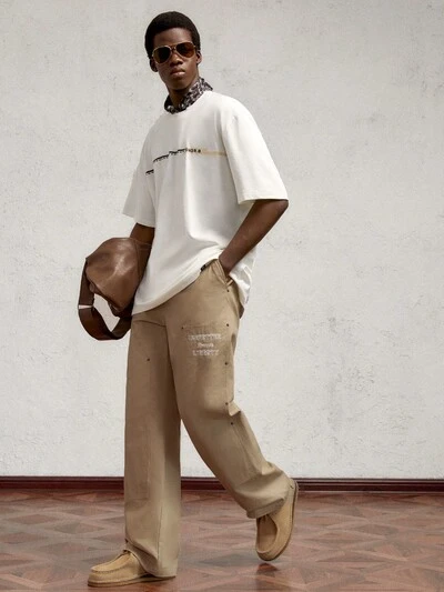 メンズ ルーズフィット レタープリント 半袖 クルーネック ホワイトTシャツ、カジュアルウェアに最適、レザーラベル付き-59%