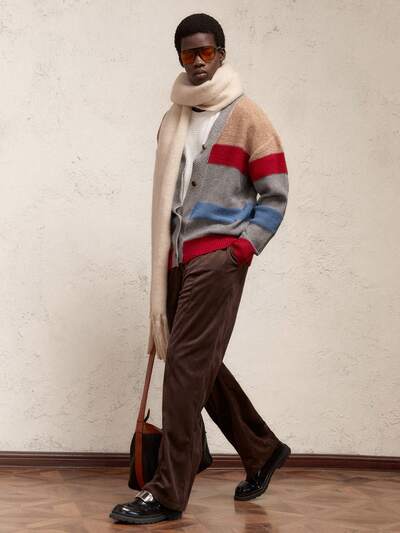 Men Loose Knit Drop Shoulder Casual Round Neck Colorblock Striped Grey Long Sleeve Cardigan, Suitable For Autumn/Winter, New Year, Christmas, Party, Drop Shoulder Chunky Cardigan, For Husband, Boyfriend Gifts