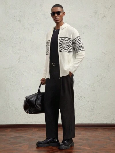 Men's Oversized Casual Color Blocking Pattern Knitted Hooded Cardigan, Suitable For Autumn And Winter