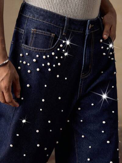 Men's Light Blue Denim Woven Pearl Decor Casual Straight Leg Jeans, Suitable For Summer, Vacation, Casual, Party, Couples, Men's Gift, Father's Day Gift, For Rave