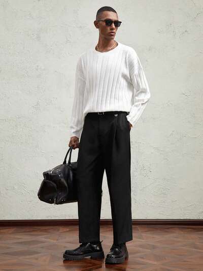 Men's Loose Fit Dropped Shoulder Crew Neck Casual Knitted Sweater, For Fall Winter