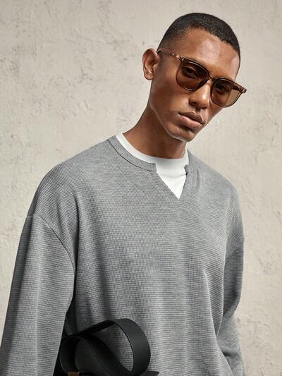 Men's Oversized Drop Shoulder Long Sleeve Casual Knit T-Shirt, Suitable For Autumn